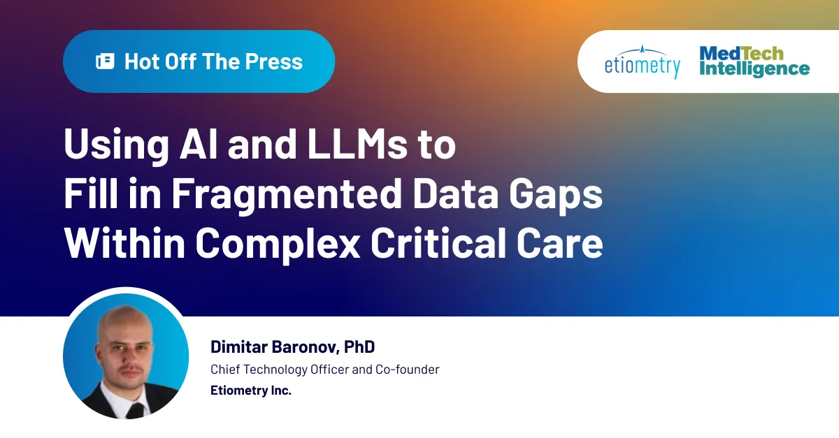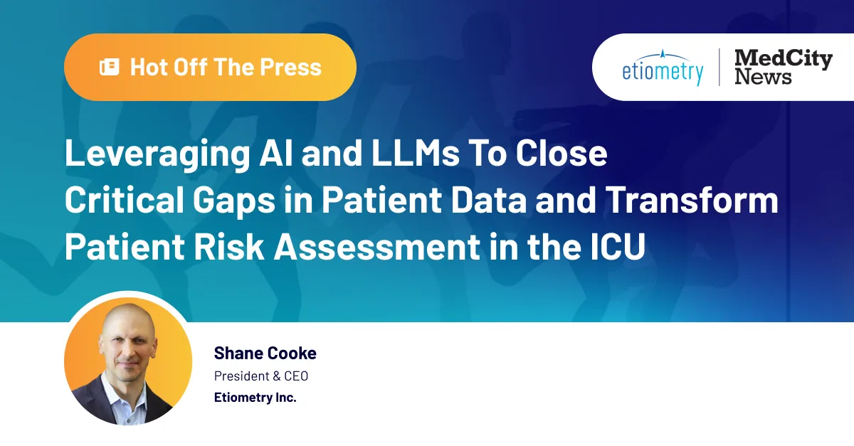 We’re proud to share that Etiometry’s President and CEO, Shane Cooke, was featured in MedCity News. In his article, Shane highlights how AI and large language models can close critical gaps in ICU patient data and transform patient risk assessment. Critically ill patients generate massive amounts of data across EHRs, monitors, and devices, but fragmentation […]